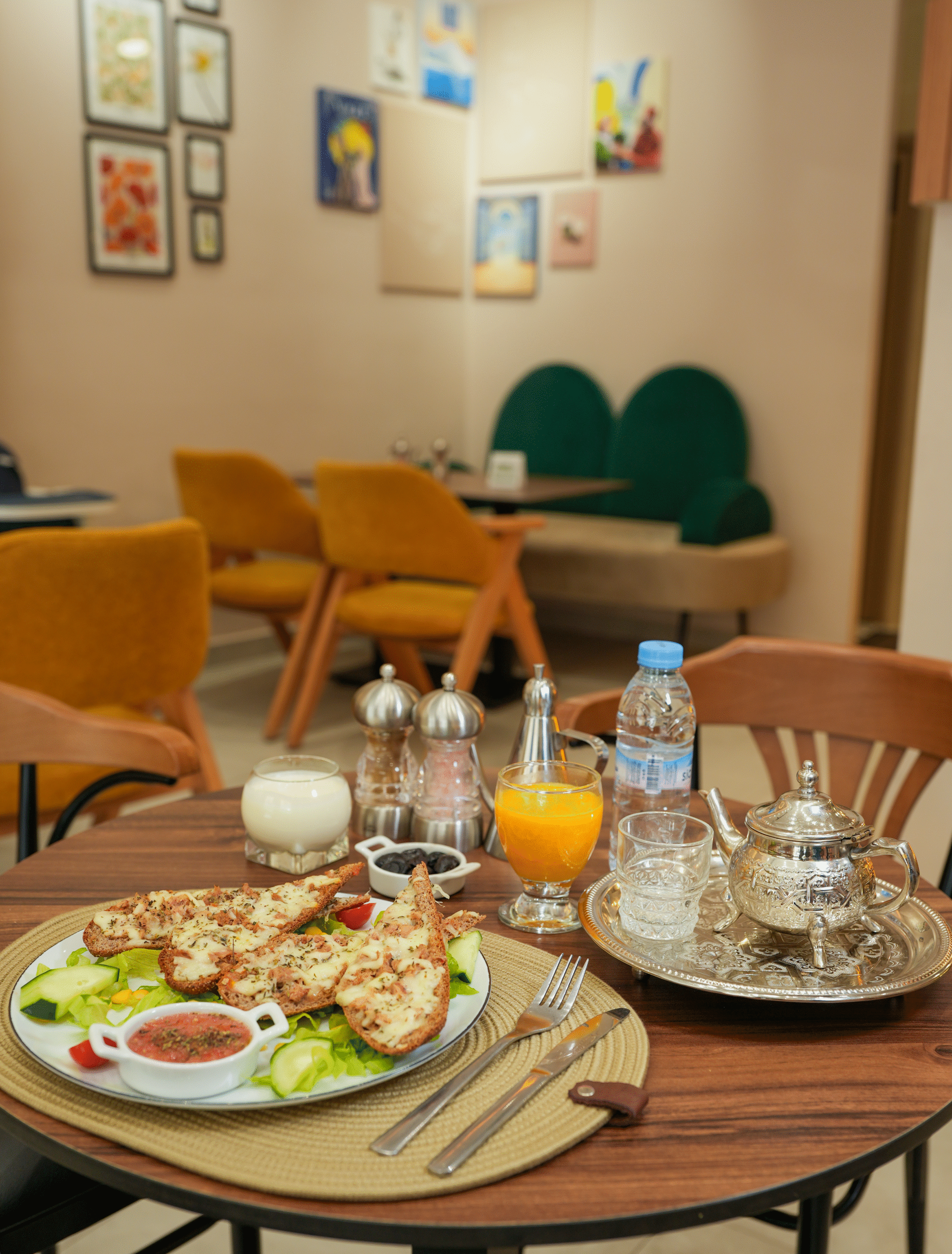 tostada – tomate concassée – thon – olives – yaourt grec – jus d’orange – fromage edam